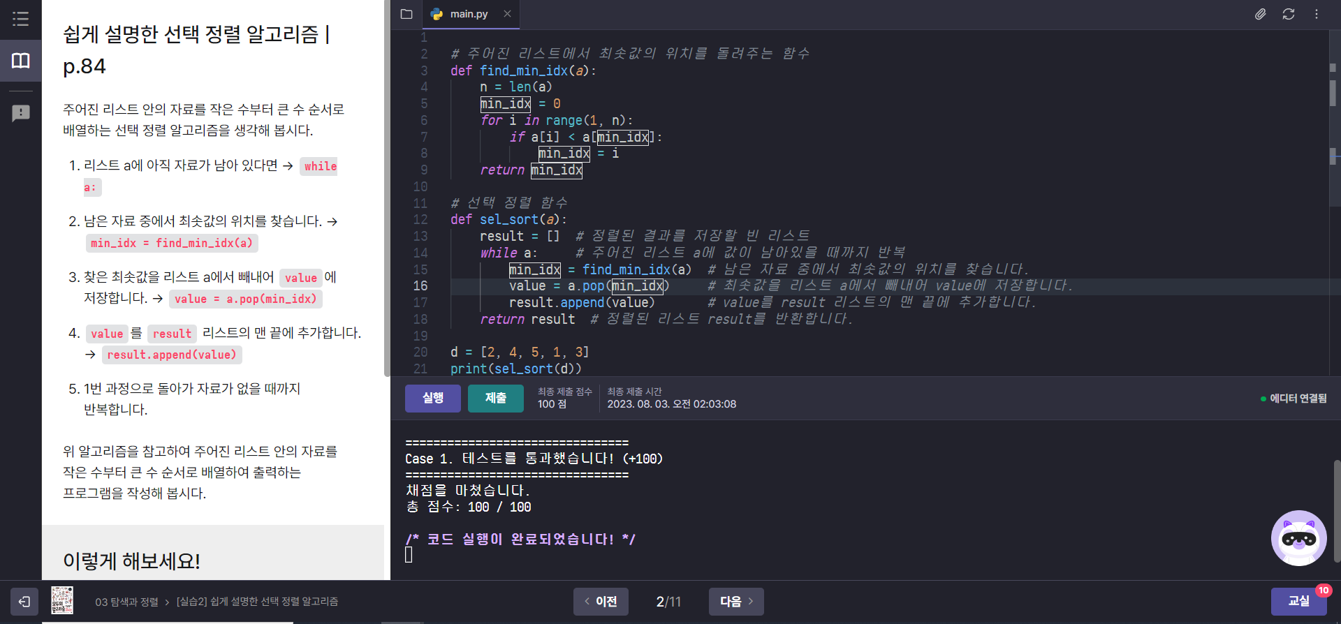 2. 남은 자료 중에서 최솟값의 위치를 찾는다. → min_idx = find_min_idx(a)