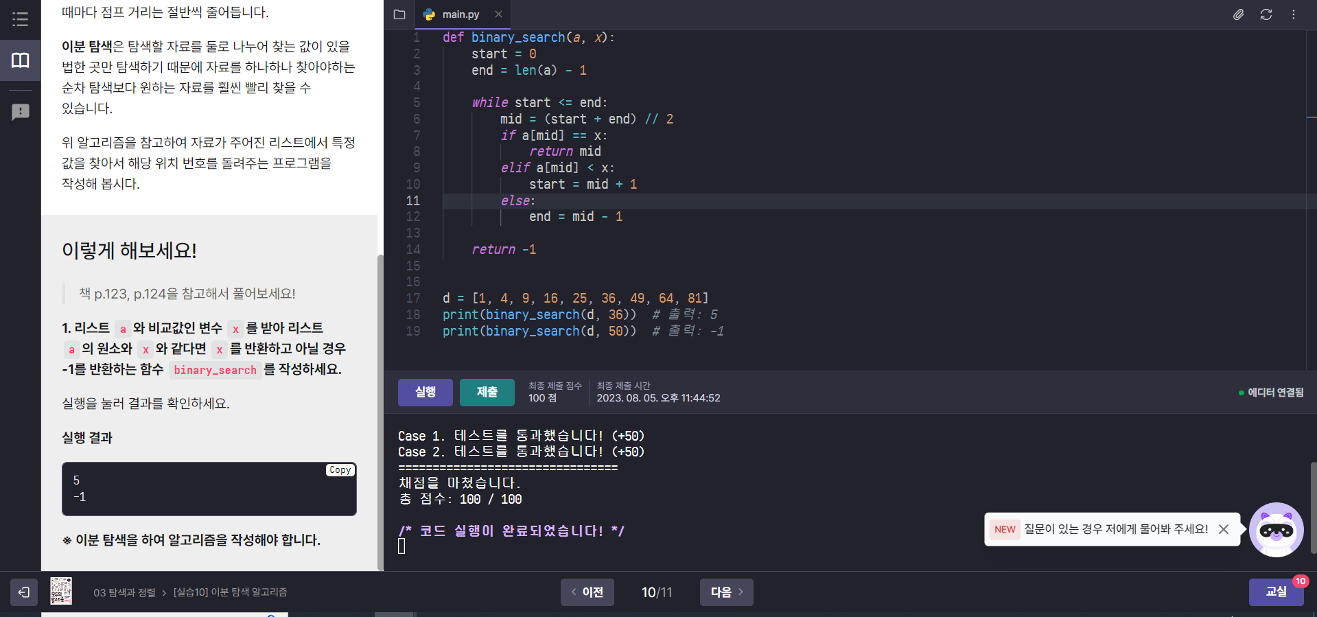 리스트 a와 비교값인 변수 x를 받아 리스트 a의 원소와 x와 같다면 x를 반환하고 아닐 경우 -1를 반환하는 함수 binary_search를 작성하세요.